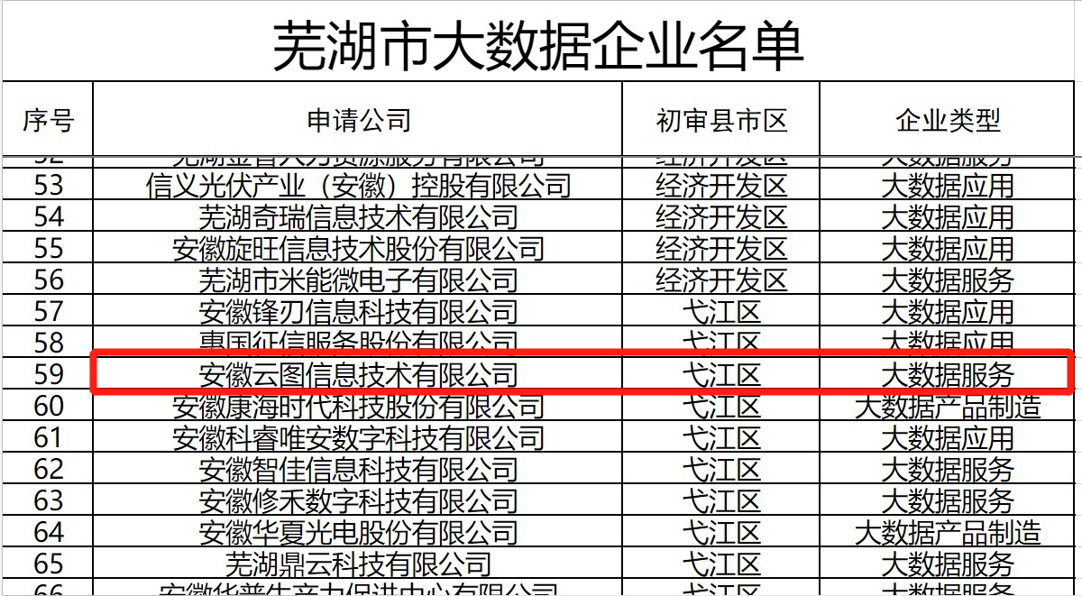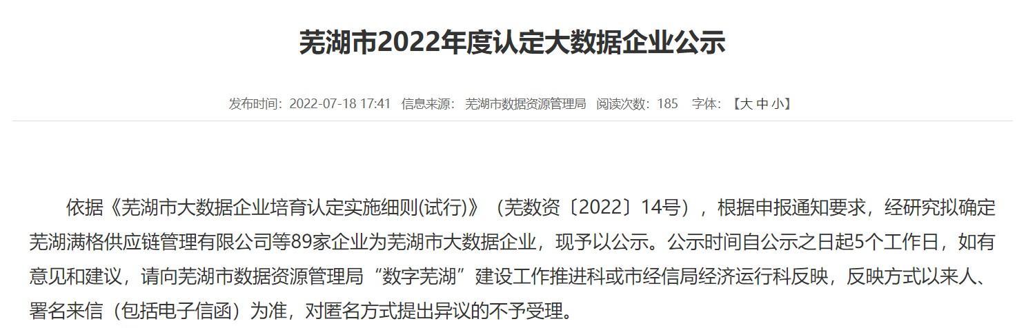 7月18日,芜湖市经信局公布了 2022年度芜湖市大数据企业认定名单,经过5天的公示期,安徽bbin宝盈信息技术有限公司等89家企业认定为2022年度芜湖市大数据企业。