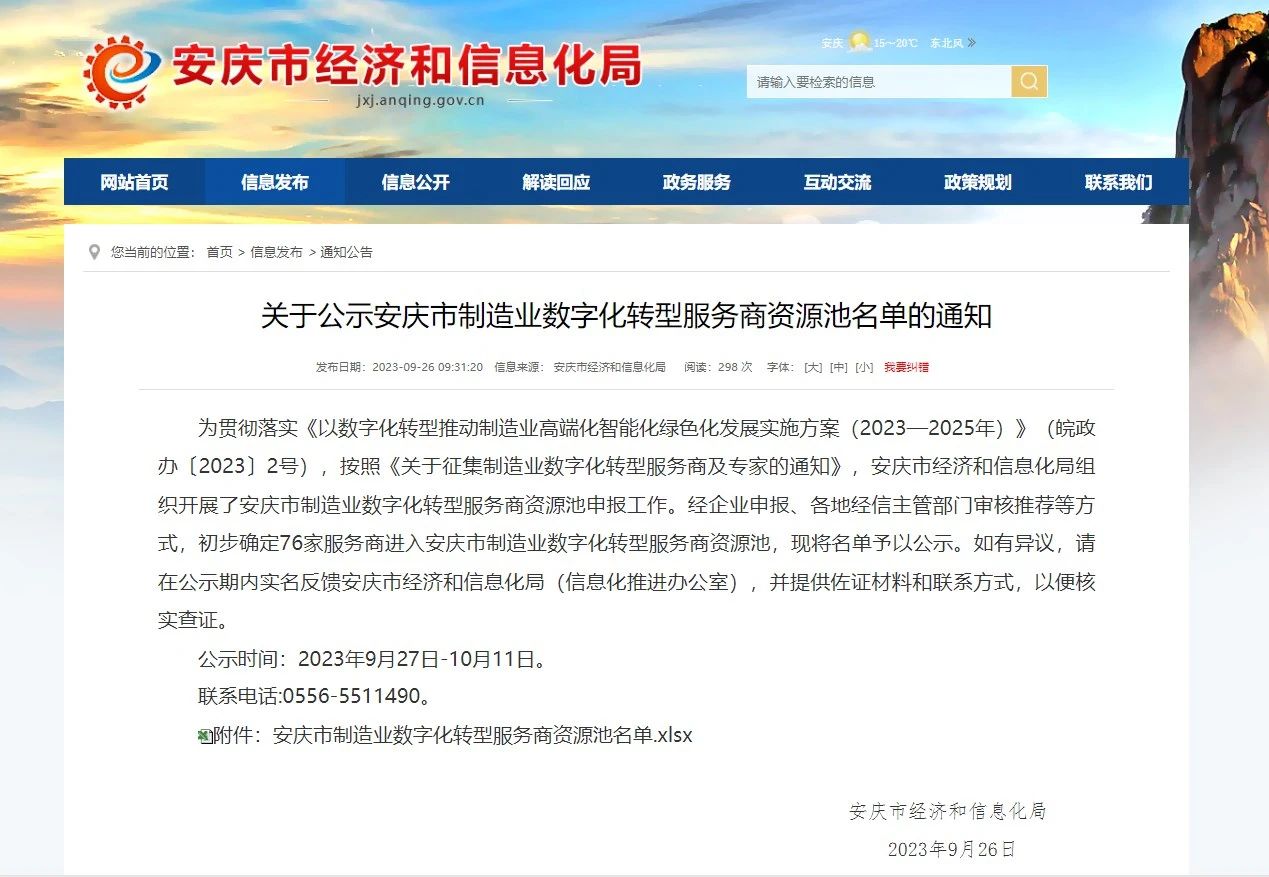 bbin宝盈头条 | 入选《安庆市制造业数字化转型服务商资源池》
