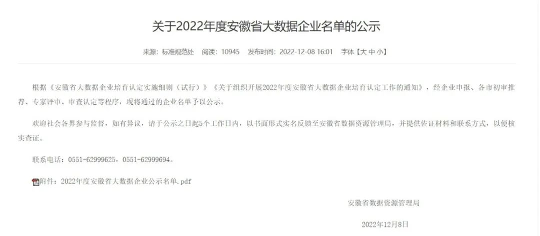 ? ? ? ?近日,?根据《安徽省大数据企业培育认定实施细则(试行)》的文件精神,经市级初审、专家评审等流程,安徽省数据资源管理局公布了《关于2022年度安徽省大数据企业名单的公示》,安徽bbin宝盈成功通过评审,经认定成为2022年度安徽省大数据企业!
