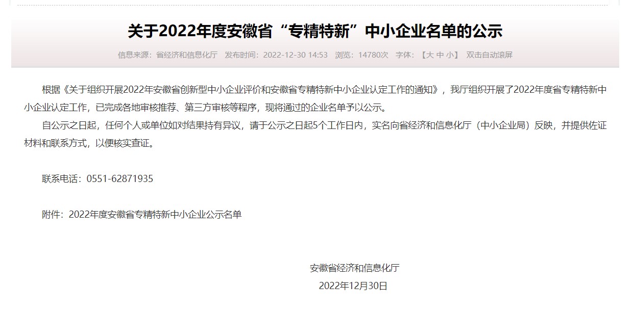 【bbin宝盈头条】热烈祝贺安徽bbin宝盈通过安徽省“专精特新”中小企业