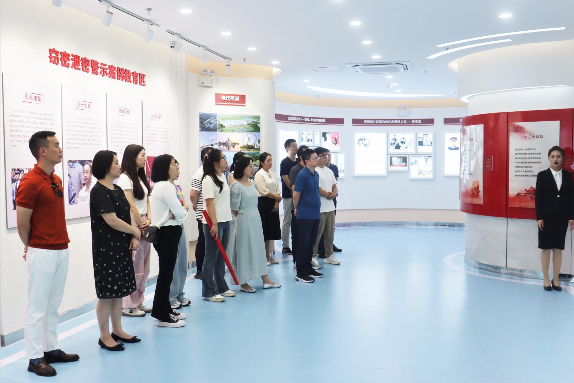 在讲解员的带领下,全体人员参观了芜湖市保密教育实训平台,过程中,通过党的保密工作历史、实例案例讲解、现场观摩和观看保密警示片等环节,为大家上了一堂深刻的保密教育课。